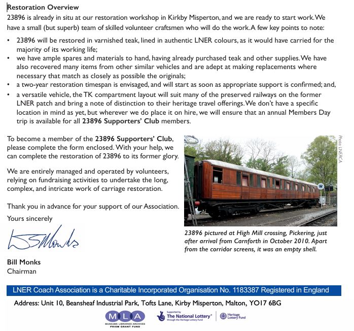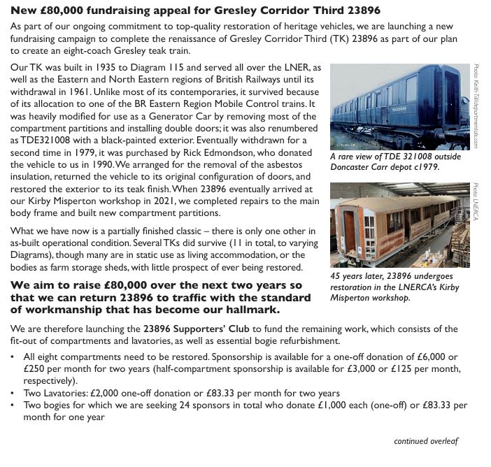 Our match funding initiative, supported by an anonymous donor, is still in being. All donations, including existing standing orders, will be matched pound for pound up to £50,000. Together with Gift Aid, this means that every £20 donation made will be worth £45 to the Association. Our bank details are: Account name – LNER Coach Association, sort code 30-63-64, Account number – 27410460.