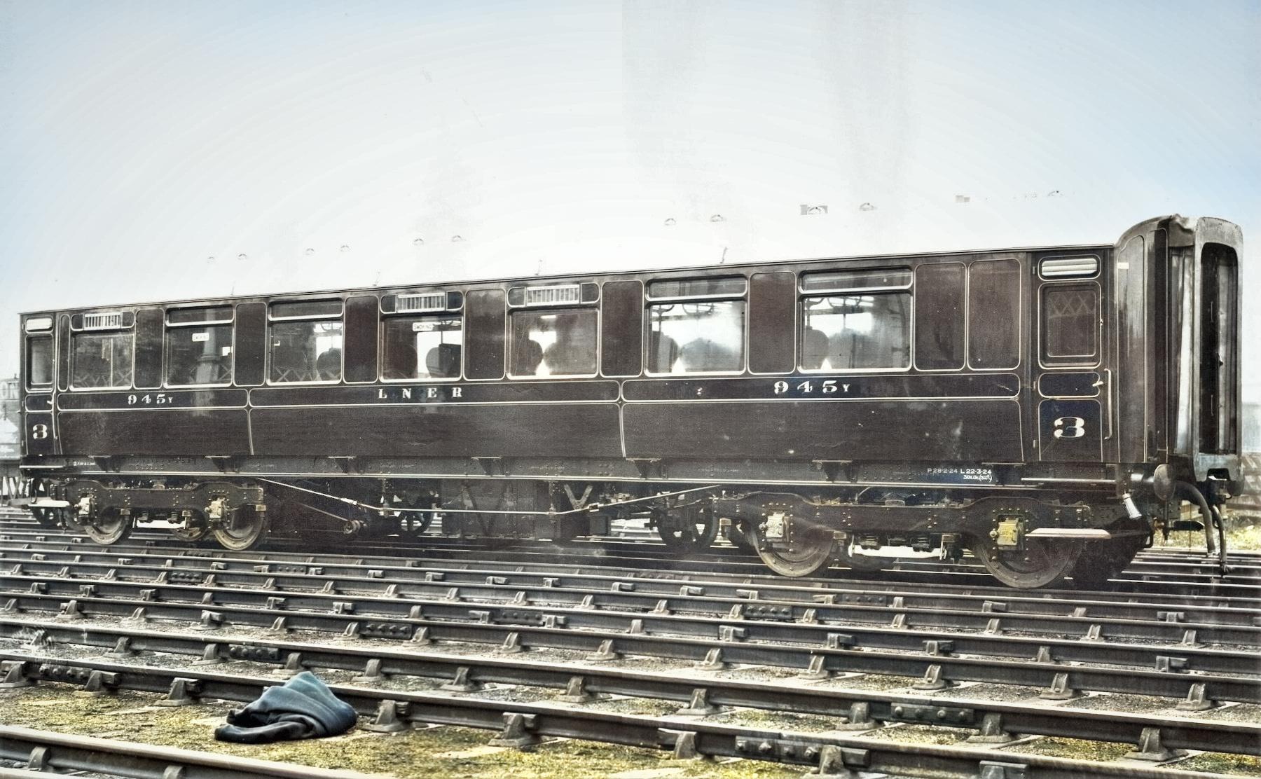 945 was completed by the LNER to NER Diagram 155. The carriage was built with standard LNER features; no end windows, Gresley bogies and Pullman gangways. It was lined in NER fashion, (to match the style of mouldings), but lettered LNER and carrying large ‘3’ numbers on the doors rather than ‘Third’. It was given the ‘y’ suffix to the number to specify that it was York built. Later the LNER adopted a ‘2’ prefix for ex NER carriages and it became 2945.